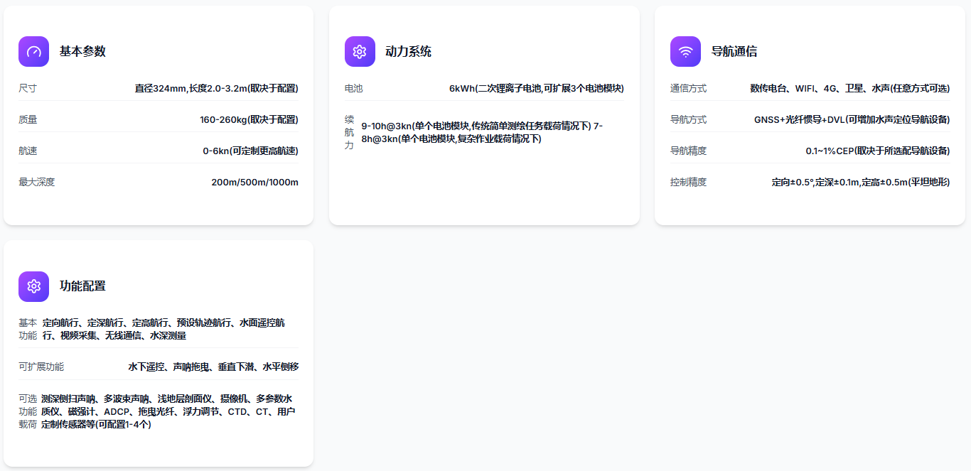 F324型AUV按照标准轻型鱼雷口径设计,是一个高度模块化的自主水下平台,可以同时搭载多种任务载荷,用于执行复杂任务。
