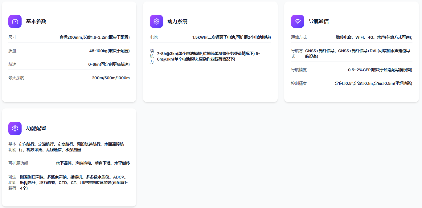 F200型AUV是一款便携式自主水下机器人,通过**大限度优化当前的微型传感器,在较小的尺寸下,实现稳定的性能与高度的可靠性。
