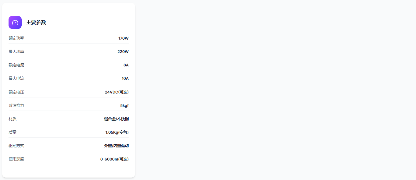 Whale510是一款小型化的**、静音水下推进器。采用哑光黑硬质氧化、纤维增强型螺旋桨和导流罩,抗腐蚀性能优良,外观精巧美观。采用**自润滑密封方式、直接驱动方案和螺旋桨水动力设计,对噪音等级进行了**控制,整体…
