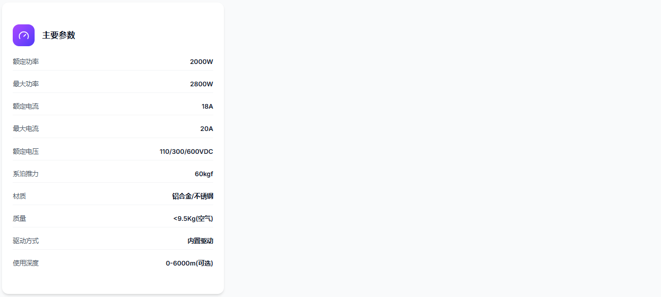 Whale6024是一款中型直驱直流无刷水下推进器。采用电机直驱方式和内置驱动方案,性能可靠稳定;通过对螺旋桨与导流罩的线型进行优化,使得这款推进器的稳定性能和水动力性能均表现优良,较国内外同功率级别推进器推力…