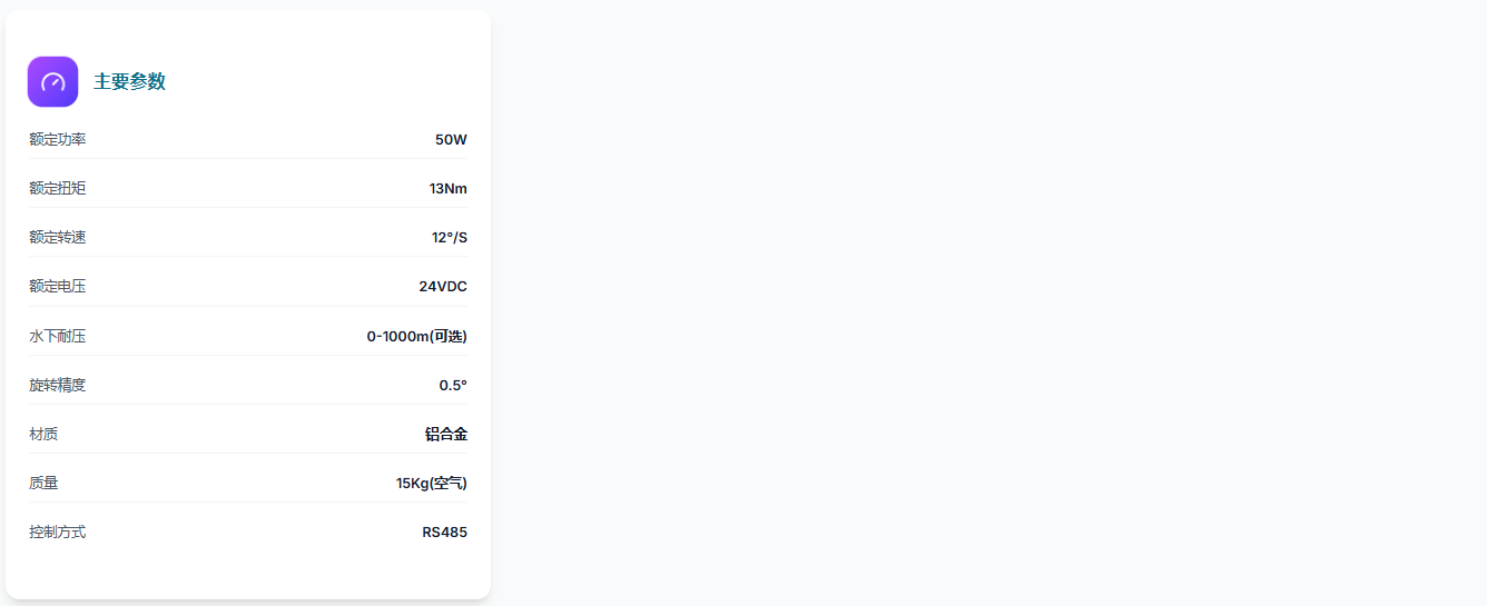 紧凑型水下云台,提供13Nm扭矩,支持RS485控制,耐压深度达1000m。