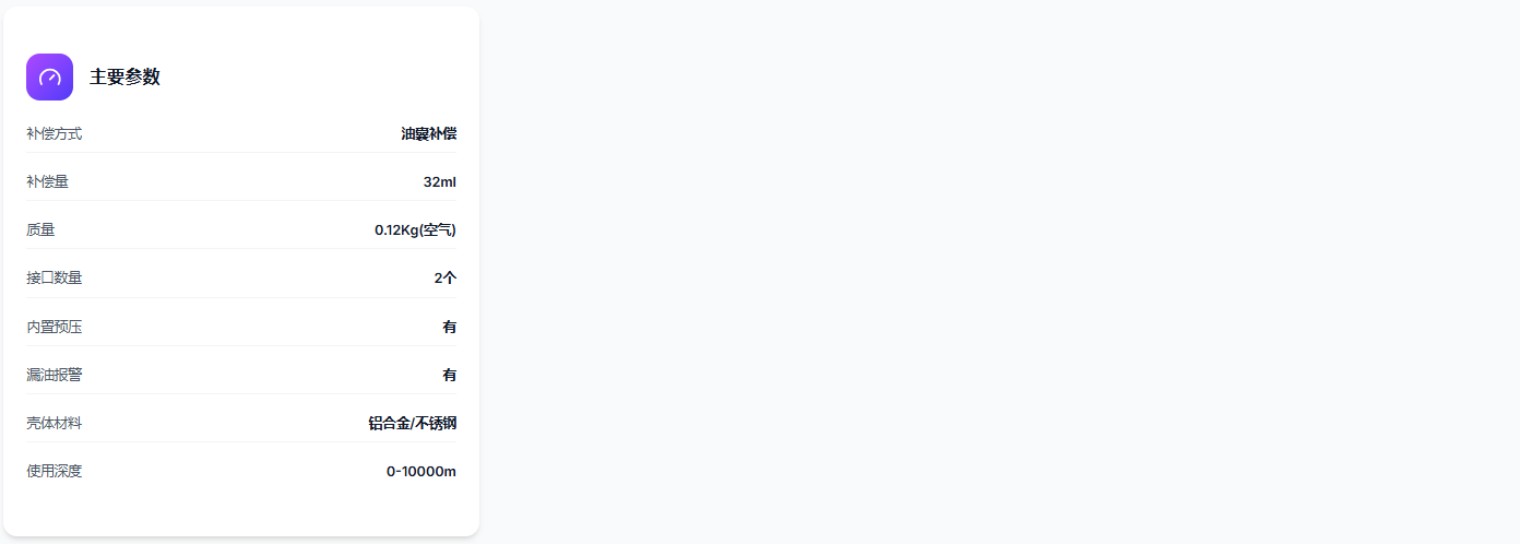 WhaleB系列深海油液补偿器。采用内置压缩皮囊,保证了密封的可靠性,采用压簧提供预压力,使得补偿压力高于外部水压,**防止海水倒灌。补偿器内置漏油报警系统,当油液泄漏时,会触发报警,对控制系统形成反馈,启动…