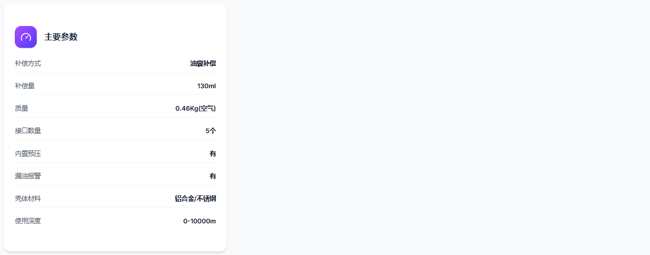 130ml油囊补偿器,具有内置预压和漏油报警功能,耐压深度达10000米。