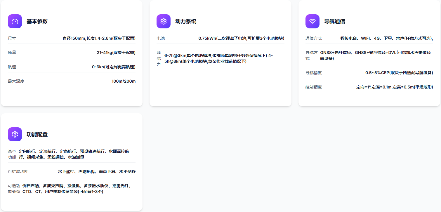 F150型AUV是一款微型自主水下机器人,尺寸小,质量轻、系统集成度高、功能完备,能够满足单人使用的需求。